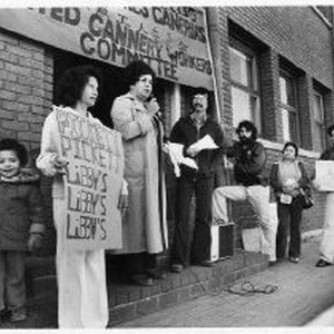 Martha Carrasco of the United Cannery Workers Committee addresses demonstrators who have gathered to protest the planned closure of the Libby, McNeil and Libby Fruit and Vegetable Cannery at Stockton and Alhambra Blvds.