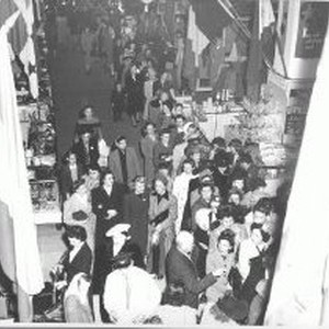 Elevated view of Weinstock's store interior and main aisle with a variety of merchandise. Includes crowd.