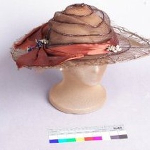 Women's orange-brown synthetic horsehair hat with rounded crown and wide brim constructed in a spiral pattern with thread-covered wire. Brim edge horsehair manipulated into a decorate pattern. Embellished on top of horsehair seams with continuous loops of brown film. Attached satin weave pleated orange hatband with deliberately unraveled ends. Satin bow and three faux flower bunches on hatband.