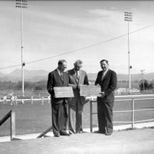 John Crump, Principal of Analy High School, Lawrence Duffield, superintendent of schools and Delbert (Deb) Triggs, President of Rotary at dedication of Karlson Field at Analy High School in Sebastopol, 1950