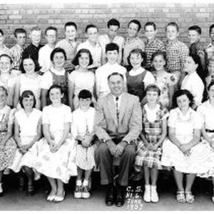 Coloma School class picture. All students, two teachers, and the principal are identified on the back. Donor's sister, Carol Friend, is in the second row, 7th from the left.