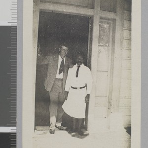 Jack London and unidentified man stand in doorway.
