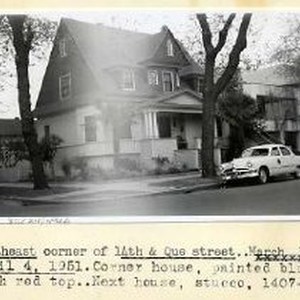 Typed on binder page "Northeast corner of 14th and Que street..March 1951. April 4, 1951. Corner house, painted blue with re dtop..Next shouse, stucco, 1407-09."