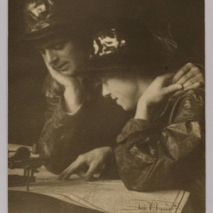 A studio portrait of Jack and Charmian London dressed in raincoats and hats. They are seated at a table, looking at a map, with a sextant on the left. Title devised by cataloger, date, location, and photographer based on an identical, but smaller, print that is in JLP 537 LA 6 (p. 37).