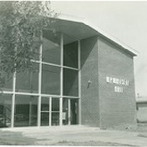 Exterior of W. P. Whitsett Hall, headquarters for the Boy Scouts in the San Fernando Valley, located at 14955 Saticoy Street.