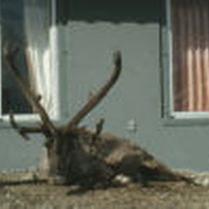 Close-up of a caribou with prominent antlerslaying on the ground near the Eielson Visitor Center.