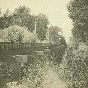 View of a locomotive traveling along the Southern Pacific Railroad Trestle between Sacramento and Davis.