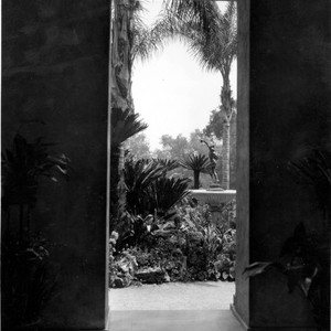 View of the fountain and rockery seen through an open door of the residence. MS note on verso reads "HEH residence: looking out to fountain and rockery."
