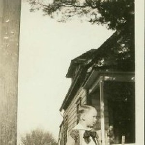Young boy stands at curb of street. House behind him. He wears tights, shorts, sweater, shirt and scarf.