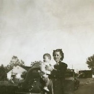 Fern poses holding baby, Ginny, on sidewalk. Ginny is daughter of Edgar's brother, Fred. Note on back says, "Isn't Ginny cute? I could eat her, the fat rascal - and always smiling."