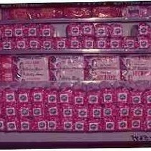 A display of Betsy Ross bread in a grocery store arranged on shelves.
