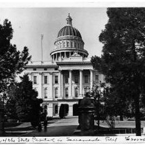 View of California State Capitol. Two unidentified people stand at the approach from the west.