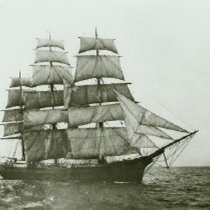 SERIES. Triple-masted sailing ship with sails furled and unfurled.