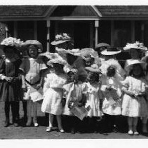 Group of young girls pose in their Easter bonnets and dresses.