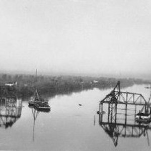 Aerial view, looking downriver, of the Freeport Bridge under construction.
