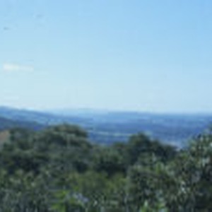 Looking down into a valley with thick green brush and trees in the foreground.