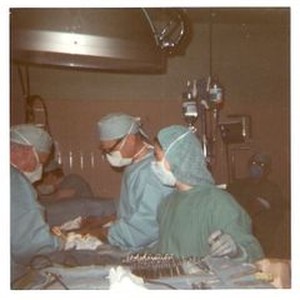 Photo--color: Dr. Horace Sharrocks on left and Nancy Phillips right in hospital surgery. Photo is from Palm Drive Hospital Scrapbooks
