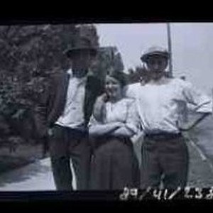 Two unidentified men and a woman standing on a sidewalk with their arms around each other. Original envelope maarked "Group with Rose May 12, 1914"