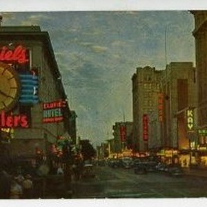 Street view of K Street at night. Daniels Jewelers is on the left.