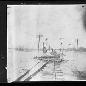 View of the flood in Washington, Yolo County in March, 1907 showing railroad tracks under water where the flood had breached the rail line.