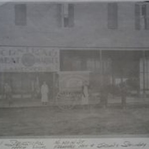 Photo--black and white: The Central Meat Market on North Main Street in Sebastopol about 1880s. Owner S. A. Meeker, Jr. The two-story brick building stands on the dirt main street with the delivery wagon and two employees in white aprons. The location of the store is approximately where Flemings Market and Jordan's Stationary later were built.