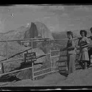 Three unidentified people standing at an overlook to Half Dome in Yosemite Park.