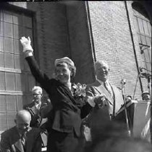 10/8/52 - "Ike" Eisenhower visits Sacramento. Mamie waves to crowd as she stands next to Governor Warren. Ike smiles in background. 3 of 9