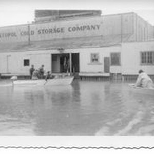 Print--black and white: 1951 flood in the Sebastopol Laguna area. The Sebastopol Cold Storage Company is surrounded by flood waters and two boats with people ply the water. The Cold storage plant was located at 500 Santa Rosa Avenue. Manager was Charles G. Holme, Jr.