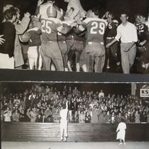 Photo--black and white: Analy High School Tigers football team of fall 1950. Two photos of the Analy Tigers vs Santa Rosa, Friday November 9th, 1950. Top photo shows Coach Leo Whalon being carried off the field after Analy's victory over Santa Rosa. Analy 19--Santa Rosa 6. Bottom photo is of standing Analy fans cheering with cheerleaders. KSRO radio Liberty Broadcasting sign at top right--a Santa Rosa radio station.
