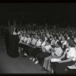 Eucharistic Congress - Fairgrounds - 4/30/50 - Nun addressing crowd of seated children 8 of 20