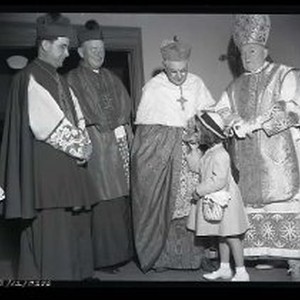 Eucharistic Congress 4/30/50 Four church leaders: l to r Bishop Hubert Newell, Cheyenne; Bishop Robert Armstrong, Sacramento; Samuel Cardinal Stritch; Susan Fletcher;; Bishop Wm. D. O'Brien, Chicago. See next 19 views for more Eucharistic Congress
