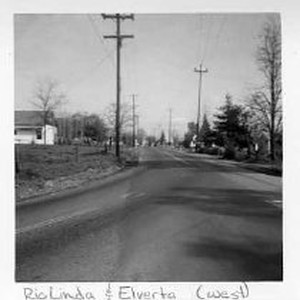 Street scene looking west on Rio Linda Blvd. and Elverta Road in Elverta showing the shoulder of the road on the west leg.