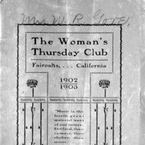 "In 1902, The Woman's Thursday Club of Fair Oaks produced their first brochure and program guide, complete with their newly drafted constitution. The brochure was owned by Mrs. Ralph W. Gore, whose husband ran a small grocery store with Charles H. Slocum." Digital scans of ephema collected for the book "Fair Oaks," published by Arcadia Publishing as part of the "Images of America" series. See page 97 of book.