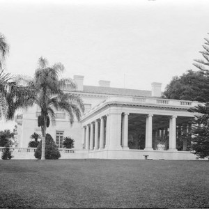 View of the southeast corner and loggia of the Huntington residence with only a few young palms and a pine tree to the east of the building. A man in a dark suit and hat stands under the palm on the left. MS note on folder reads "HEH residence: south and west facades." MS note on verso reads "HEH residence: loggia."