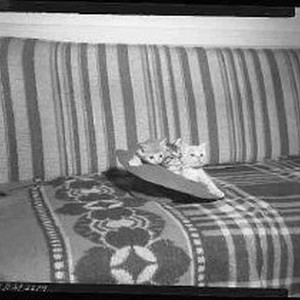 Three Kittens in hat. on sofa. - 1964