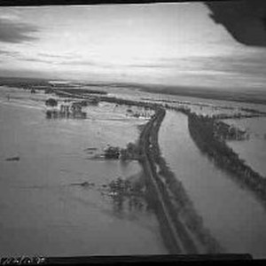 Flood Yuba City, Aerial of flooded riverside farmlands. 12/25/55