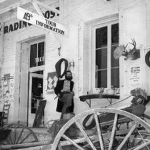 The front of a store in Jackson, California with relics from the gold-rush days in front, including a one-axle wooden carriage. The sign posted on the wall indicates it was the Mine Commissary Store.