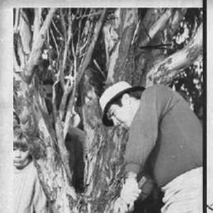 Bob Lunn, pro golfer from S.F. and Haggin Oaks. Here, Lunn hits the ball from in front of a tree as spectators watch
