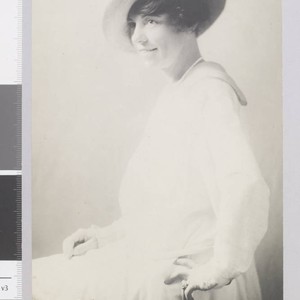 Studio portrait of Charmian London in hat. Title and date transcribed from envelope. "Charmian Honolulu, 1916" is handwritten on the bottom front of photo.