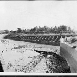 Album of the "Colorado River Trip" December 5 to 12, 1925. Consulting Engineering Committee to Water Resources Investigation. Division of Engineering & Irrigation: State Department of Public Works. Photographs by W. L. Huber. Caption under photo reads: "Headgates to main canal of Yuma Reclamation Project . . ."