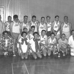 Photo--Black and white: Analy High School Faculty basketball team of 1951. Back row L-R: ?, Keck Knight, Edwin Hampil, Glenn Ament, Dolan Evans, Barney, Evans, Lewis Heinrichs, Alden Snyder, Leo Whalon. Middle two: ?, David Kessles. Front Row: Clarence Irish, Anita Tarchini, Shirley Thompson, Walt Foster, ?, Gerald Hohl, Arden Allen.