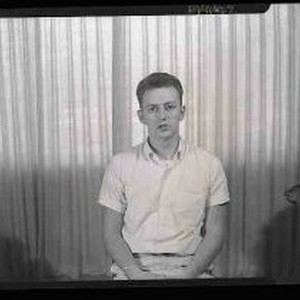An unidentified young man posed with hands together in front of a large curtain which takes up the background.