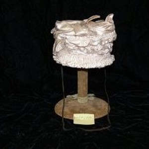 Child's, ivory colored straw hat, decorated with lace and ruching of silk fabric. Hat has the word "MANCHESTER" printed inside.