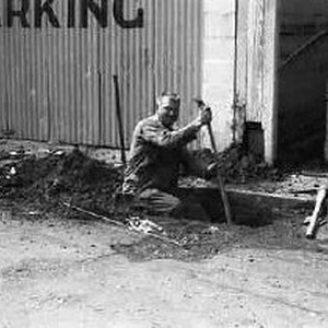 Demolition of residential area as part of Sacramento Housing and Redevelopment Agency project. Photograph of worker crouched and holding tool.