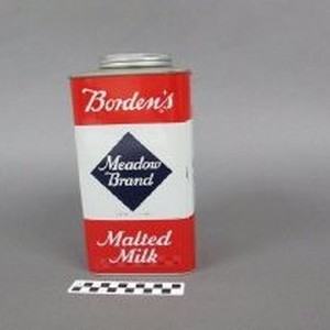 Can for Borden's Meadow Brand Malted Milk; red, white and blue.