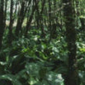 Bushes of large leaves surrouding tree trunks at SSBS Study Trail.