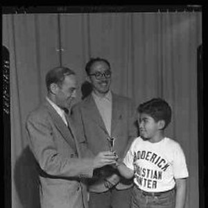An undentified boy receiving a very small trophy award from two men. The boy is wearing a t-shirt on which is printed "Broderick Christian Center". Original container marked "East Yolo Record"