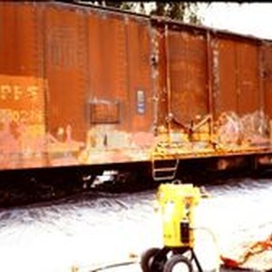 Pacific Fruit Express boxcar being refurbished and sand blasted for the West County Museum at 261 South Main Street in Sebastopol, California, 1995