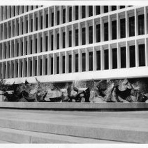 Exterior view of the new courthouse with the Proteus Fountain in front.