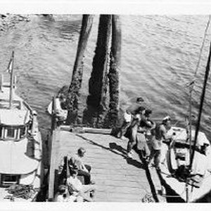 Elevated view of two boats, one a sailboat, docked at a pier for loading passengers. Bowen Island is 12 mi. north of Vancouver, B.C.